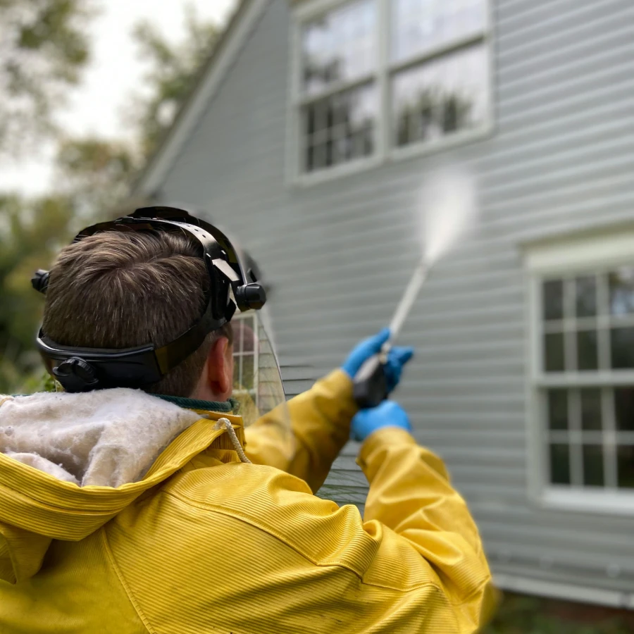 - Używając myjki ciśnieniowej, trzymaj lancę pod kątem (nie prostopadle do ściany) i zachowaj bezpieczną odległość (min. 30–50 cm).