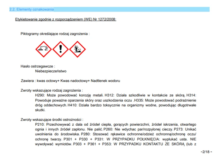 - Aktywne składniki (kwas octowy, nadoctowy i nadtlenek wodoru) zapewniają szerokie spektrum działania przeciwko drobnoustrojom.