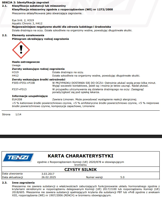 TENZI Detailer CZYSTY SILNIK to innowacyjny środek stworzony z myślą o skutecznym i bezpiecznym czyszczeniu silnika oraz jego elementów. Preparat rozpuszcza nawet najtrudniejsze zabrudzenia ropopochodne, kurz drogowy i osady eksploatacyjne.