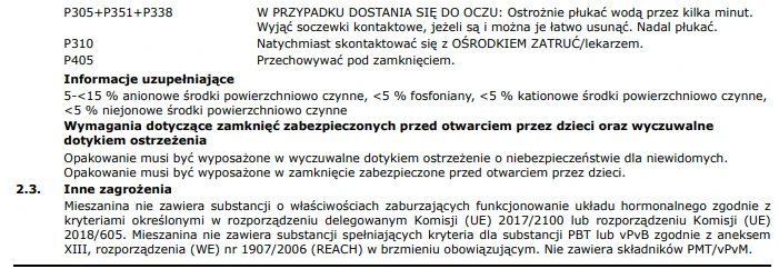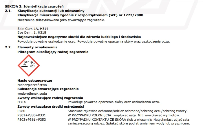 Przed użyciem należy zapoznać się z kartą charakterystyki produktu i stosować się do zaleceń bezpieczeństwa (używać rękawic i ochrony oczu).