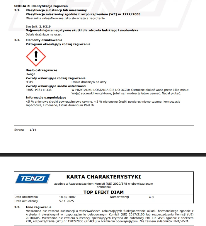 Dzięki innowacyjnej formule opartej na emulsjach woskowych skutecznie usuwa zabrudzenia, jednocześnie zabezpieczając powierzchnię przed ponownym osadzaniem się brudu. TENZI TopEfekt® DIAM nie tylko dokładnie czyści posadzki, ale także odnawia i uzupełnia warstwy polimerowe, nadając im delikatny połysk bez smug. Właściwości antypoślizgowe, antystatyczne i antyrefleksyjne preparatu zwiększają bezpieczeństwo i komfort użytkowania w przestrzeniach biurowych, obiektach publicznych i komercyjnych. Produkt nie wymaga spłukiwania, co czyni go wyjątkowo praktycznym środkiem do codziennej pielęgnacji i polerowania podłóg. TENZI TopEfekt® DIAM to profesjonalny płyn do mycia posadzek, który zapewnia kompleksową ochronę i doskonały efekt estetyczny.